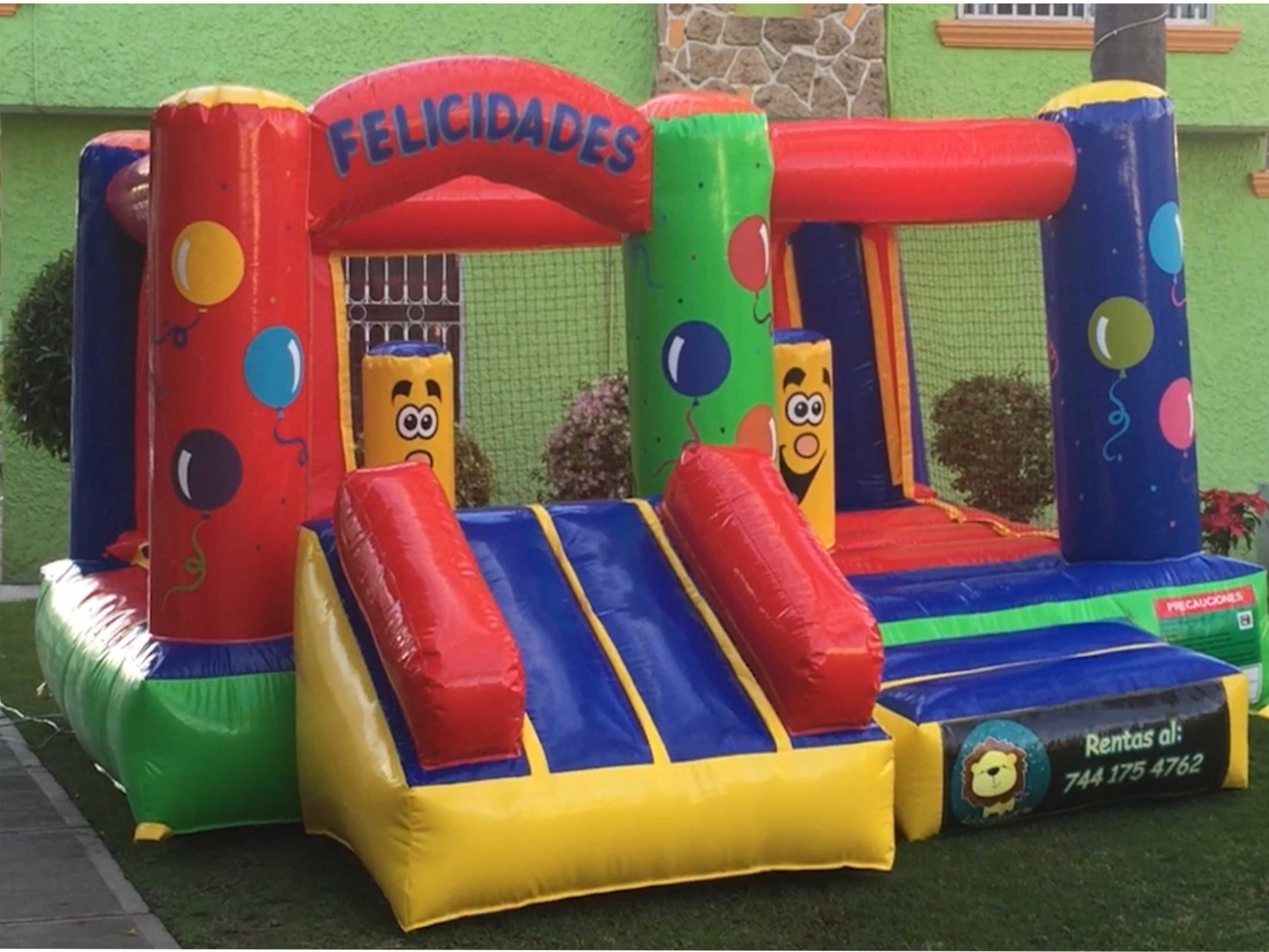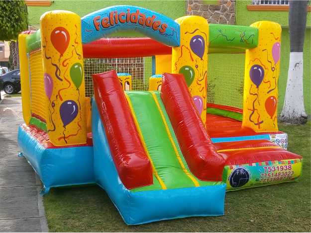💸 Negocio rentable: Puedes rentarlo cada fin de semana y recuperar tu inversión rápidamente. 🎉 Alta demanda: Por su diseño neutro con «Felicidades», es ideal para cualquier tipo de evento. 🛝 Rampa frontal: Fácil acceso para los niños, lo que lo hace más llamativo. 🔧 Tiempo de elaboración: 4 semanas. 📏 Tamaño: 4 m de ancho x 4.5 m de largo. 💎 Material: Lona PVC reforzada, costuras dobles y gráficos llamativos.