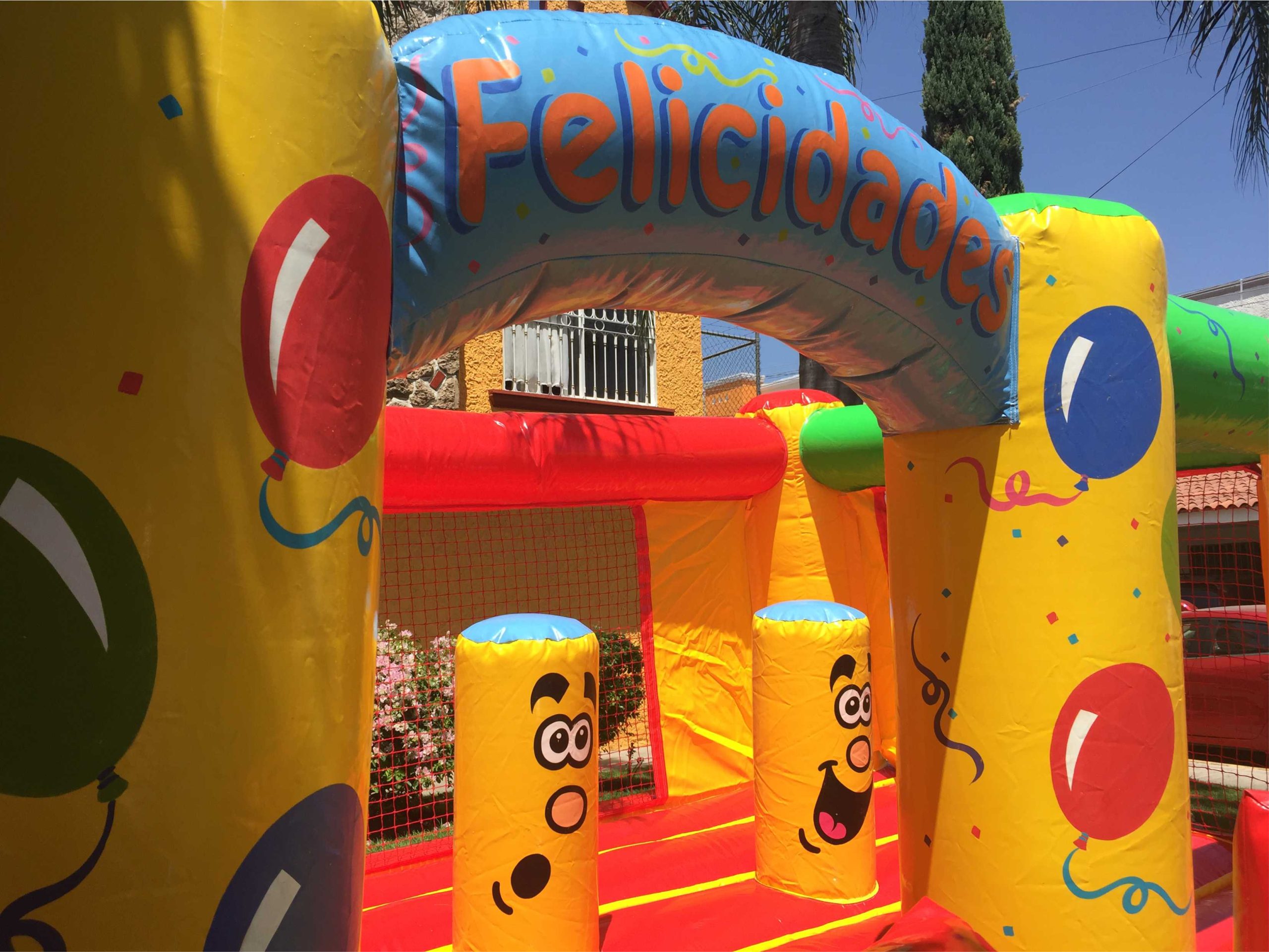 Brincolín inflable cubo de 4×4.5 m con rampa al frente, rotulado con «Felicidades». Perfecto para rentar en todo tipo de eventos. Negocio rentable.