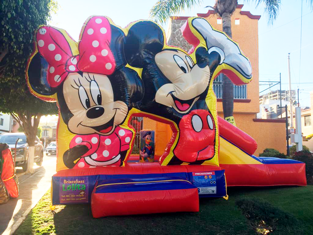 Inflable Mickey y Minnie 5x4m con rampa. Diseño temático, seguro y resistente. Perfecto para renta en fiestas infantiles y eventos especiales.