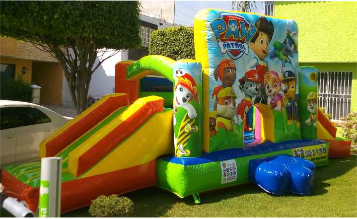 Brincolín inflable Paw Patrol con doble rampa de 8x4m, perfecto para eventos y renta. Fabricación en 4 semanas. Envíos a todo México (costo extra).