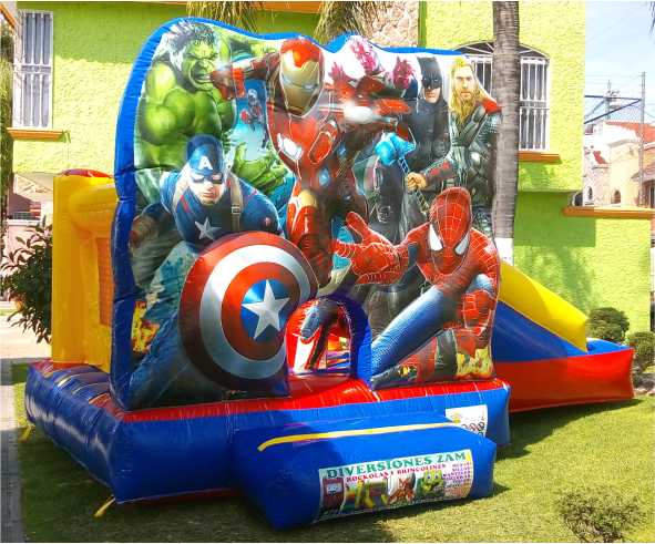 Inflable 5x4m de Los Vengadores con muro frontal. Diseño atractivo, resistente y seguro. Ideal para renta en fiestas y eventos infantiles.